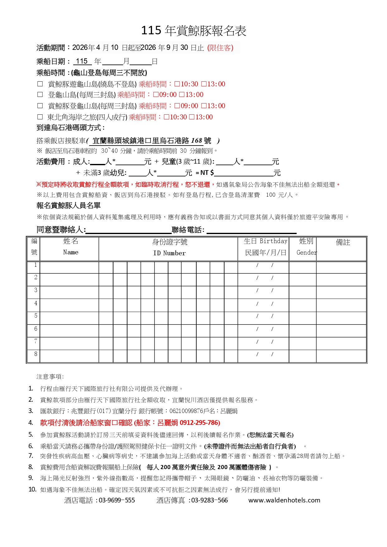 【報名資料】乘船者姓名、身分證、出生年月日、聯絡電話